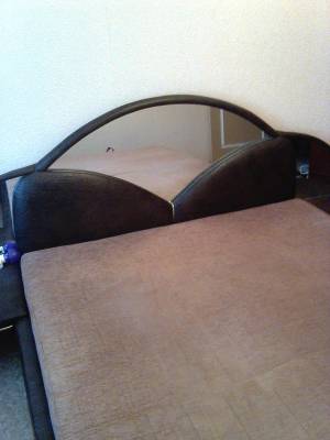 Продам 2-х спальную кровать б\у в хорошем состоянии, обшита дермантином, полочки ,вставка зеркало ,ниша для белья